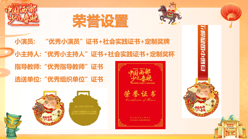 目前,首届中国西部少儿春晚正面向中国西部十二省(直辖市、自治区)开展节目征集,3—16 周岁青少年儿童均可参加,参演类别包括声乐类、舞蹈类、语言类、器乐类、才艺类、主持类等,节目需积极向上、艺术精湛、特色浓郁、喜庆欢快。晚会将于2026年1—2月期间在省妇女儿童中心新搭建的演播大厅进行录制,农历大年三十至正月十五期间,在四川电视台科教频道,以及央视频、人民网等新媒体平台播出。经首届中国西部少儿春晚节目组导演、专家、评委认可,入选节目的指导机构、培训老师、演员、主持人等,可获得由主办方颁发的证书、奖牌等。