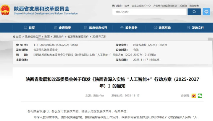 11月17日,陕西省发展和改革委员会印发《陕西省深入实施“人工智能+”行动方案(2025-2027年)》。