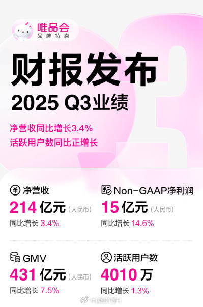 在线品牌折扣零售商唯品会发布2025年第三季度财报。财报显示,唯品会第三季度实现净营收214亿元(人民币,下同),同比增长3.4%;Non-GAAP净利润15亿元,同比增长14.6%。同时,第三季度活跃用户数为4010万,同比增长1.3%;商品交易总额(GMV)为431亿元,同比增长7.5%;订单量为1.66亿单,同比增长1.5%。
